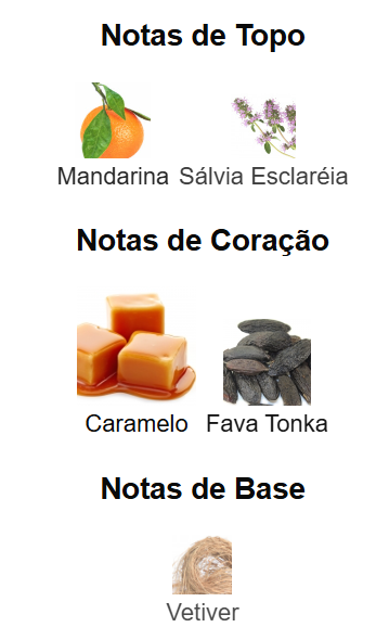 As notas de coração são: Caramelo e Fava Tonka. A nota de fundo é Vetiver.